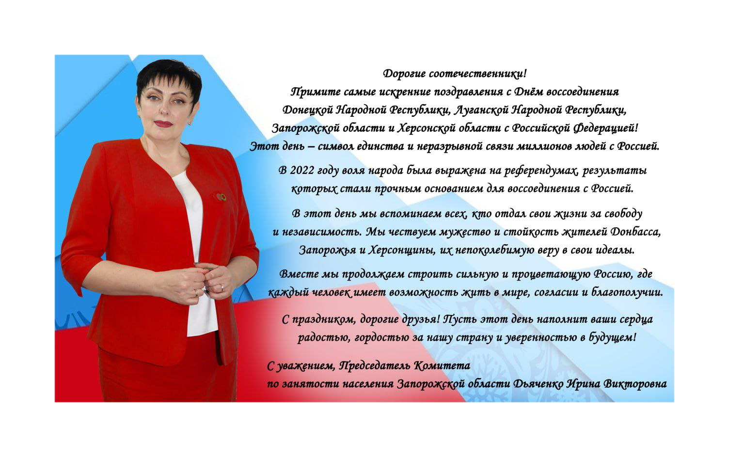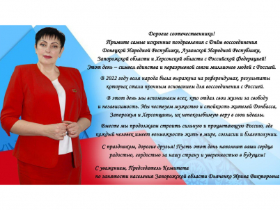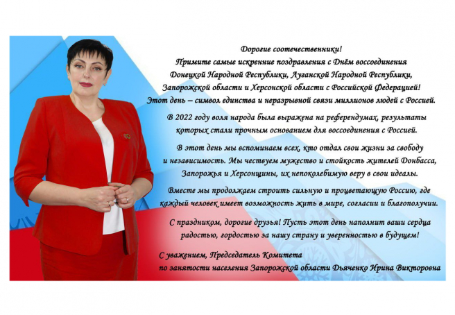 Поздравление Председателя Комитета по занятости населения Запорожской области Ирины Дьяченко с Днём воссоединения Донецкой Народной Республики, Луганской Народной Республики, Запорожской области и Херсонской области с Российской Федерацией